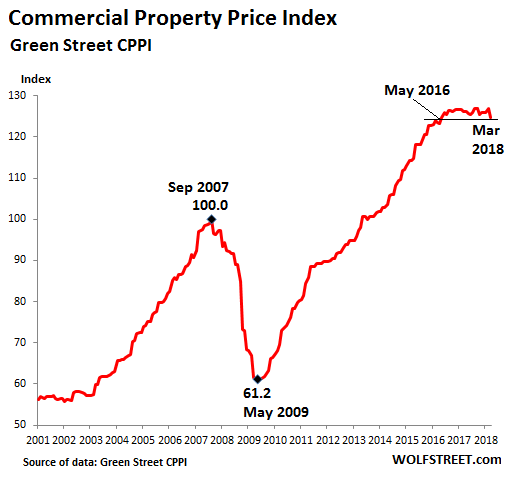 Commercial real estate prices collapsed nearly 40% during the Financial Crisis, according to the Green Street Commercial Property Price Index (CPPI). Then prices more than doubled from the low in May 2009 and peaked in September 2017, when the index was 27% above the crazy peak of the prior bubble.