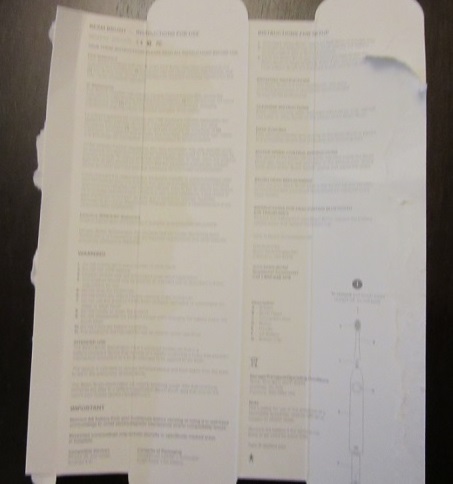 And there’s the part you certainly are not supposed to read because it’s the compliance language about radio interference, compatibility with US, Canadian, and European standards, in English and French, etc., etc. No one reads this stuff. So I read it because this is a “free” toothbrush, and I better read everything.