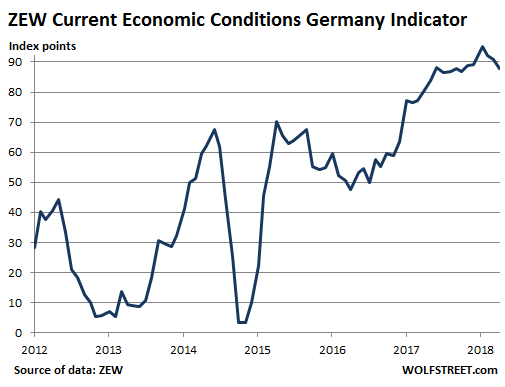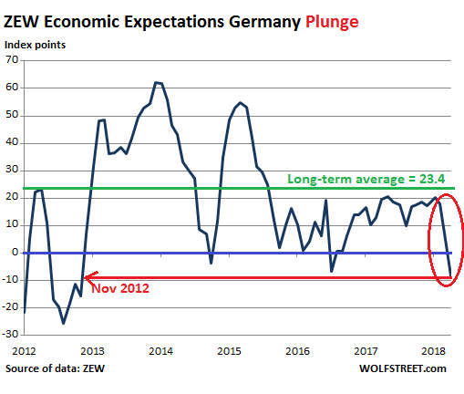 It named other reasons for the decline in expectations about future economic development, including “the current situation in the Syrian war,” and internal issues, such as the “significant decline in production, exports, and retail sales in Germany in the first quarter of 2018.” So things aren’t so hunky-dory at home either at the moment.