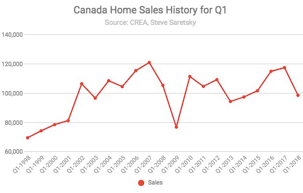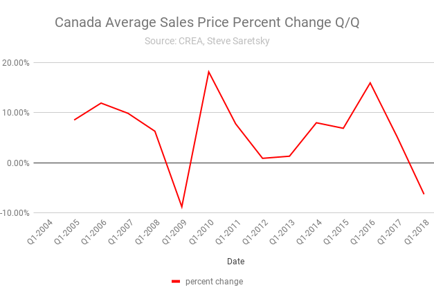 To little surprise this reflected in the national home prices across Canada. The Q1 2018 average sales price declined by 6.27% from Q1 2017. It was the first year-over-year percentage decline since Q1 2009.