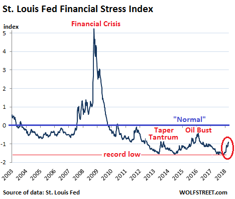 The Financial Stress Index, released weekly by the St. Louis Fed, is designed to track financial conditions that companies face in the markets. It reached record lows in November – meaning that there was extraordinarily little “financial stress” in the markets after years of ultra-easy monetary policies. The index then ticked up a little and did a mini-spike in February, but was still far below the historical “normal.” Then it zigzagged higher. Last week it had risen to the highest level since the Oil Bust two years ago, though it remained way below historical “normal.” In the current release, the index backed off again.