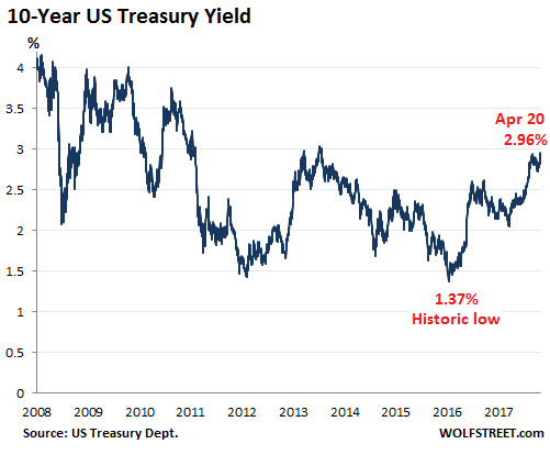In mid-February, as the 10-year yield was soaring and threatened to take out the 3% level, I speculated that it would run into a wall over the near term, for two reasons: Enormous demand at the 3% level, and record short positions by hedge funds against the 10-year Treasury. This begged for a contrarian rally, or even a short squeeze. While the ensuing rally wasn’t exactly spectacular, it pushed the yield down to 2.73% by early April. But since then, the 10-year has sold off again. Now with the yield at 2.96%, it might try to make another run at breaking 3%.