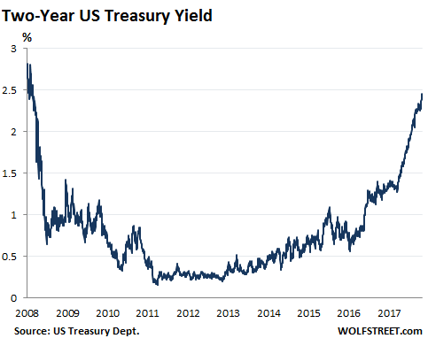 The two-year yield had no such moment of rest. It rose to 2.46% on Friday, the highest since August 11, 2008, and up from 2.31% on rate-hike day in March: