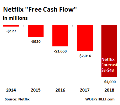 In total, it forecasts to be “free-cash-flow negative” between -$3 billion and -$4 billion in 2018. So the next quarters, when the “timing differences” are reversing, the negative free cash flow is going to be a doozie. And it also disclosed that it would be “free cash flow negative for several more years as our original content spend rapidly grows.”