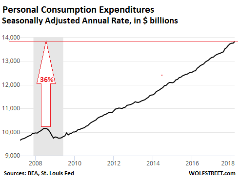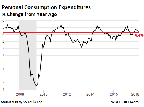 Consumer spending on goods and services – which includes anything from toys to rent and which accounts for over two-thirds of GDP – rose by 4.4% in March from a year ago, according to the Bureau of Economic Analysis this morning. This growth rate is in the upper third of the range of the past few years. Solid but not spectacular comes to mind.