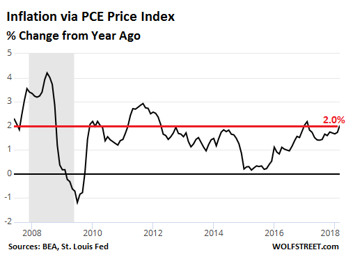 The BEA also released the PCE price index this morning – the Fed’s favorite inflation measure because it usually tracks lower than the Consumer Price Index and thus further understates the deterioration of the purchasing power of the dollar as consumers experience it. The PCE price index rose by 2.0% from a year ago, which is right smack-dab on the Fed’s target. And it’s up from 1.7% in February. Note that the Fed’s target of 2% inflation isn’t a minimum, but a target.