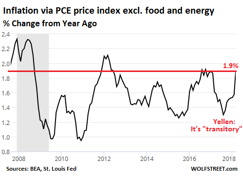 The Fed is even more focused on the PCE price index without food and energy – not because food and energy are not important to consumers, but because their prices can gyrate wildly. And this core PCE price index jumped by 1.9% from a year ago. Up from an increase of 1.6% in February. And the spike-like trend looks worrisome.