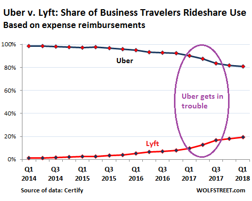 But within the rideshare universe, a special battle has been fought between Uber and Lyft in terms of ground transportation reimbursement. Uber’s share was 98.8% in 2014, when Lyft just nibbled away a few crumbs, amounting to 1.2%. By Q1 2018, Uber’s share dropped to 80.9%, and Lyft’s share surged to 19.1%.