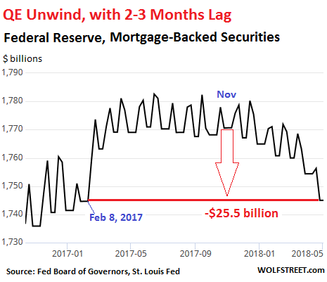 During the years and iterations of QE, the Fed acquired $3.4 trillion in Treasury securities and mortgage-backed securities. The mortgages underlying those MBS are guaranteed by Fannie Mae, Freddie Mac, and Ginnie Mae. The “balance sheet normalization,” as the Fed calls it, was nudged into motion last October. But the pace accelerates every quarter until it reaches up to $50 billion a month in Q4 this year.