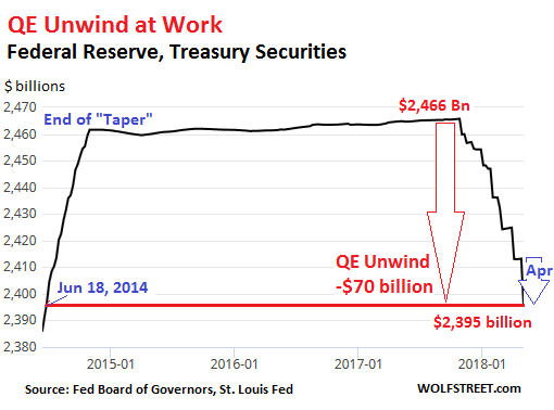 The QE Unwind is ramping up toward cruising speed. The Fed’s balance sheet for the week ending May 2, released this afternoon, shows a total drop of $104 billion since the beginning of the QE Unwind in October – to the lowest level since June 11, 2014.