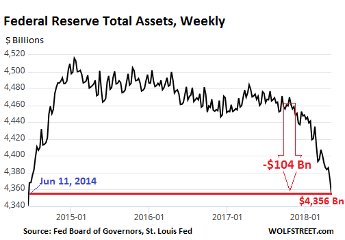 Total assets on the Fed’s balance sheet dropped by $30 billion in April, and by $104 billion since the beginning of the QE-Unwind, to $4,356 billion. This is the lowest since June 11, 2014. Note that total assets are now down by $160 billion from the peak in January 2015: