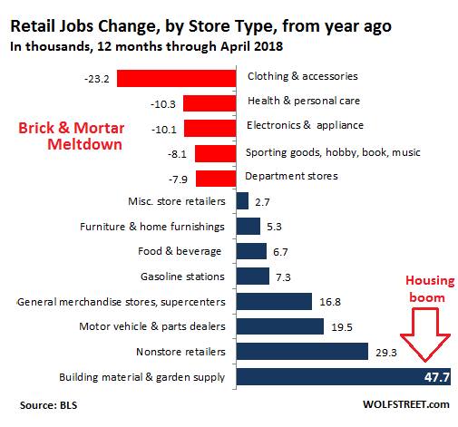 Even “retail trade” has added 76,000 jobs over the past 12 months. So what about the “brick-and-mortar meltdown?” Turns out, part of the retail industry is booming, and part of it is truly melting down: