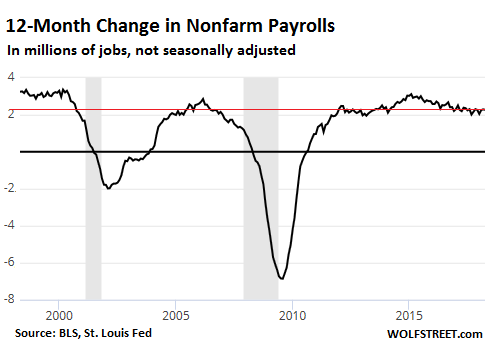 The online-resistant sectors and online-related “nonstore retailers” are adding jobs: “Food and beverage stores” (with 3.1 million jobs), “Motor vehicle and parts dealers” (with 2.0 million jobs), “General merchandise stores & supercenters,” (with nearly 2 million jobs, including at Walmart, Costco, etc.), and gasoline stations (with nearly 1 million jobs).
