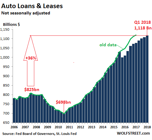 The green line in the chart indicates the old data. In September 2017, the Federal Reserve implemented a big adjustment of consumer credit data going back through Q4 2015. This adjustment was based on survey data collected every five years. So routine. The adjustments hit auto-loan balances disproportionately, knocking them down by $38 billion retroactively for Q4 2015. To show the distortive effect of the adjustment – and to show that it wasn’t the collapse of the car business – I added the old data in green.