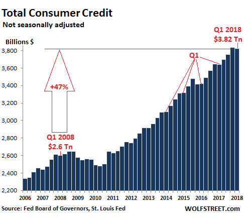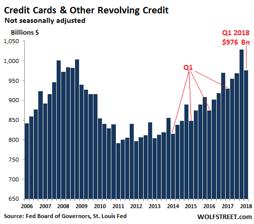 But wait… Q4 credit card balances of $1.03 trillion had been an all-time record, finally beating the record of Q4 2008. And Q1 2018, at $977 billion, set a record for any first quarter, beating Q1 2008 by a smidgen ($973 billion). So Americans did their job piling on high-profit debt.