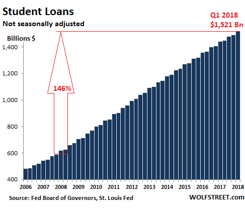But it’s not like more people are going to college. Higher-education enrollment had peaked in 2010 and declined at least through 2015, according to the last data available from the National Center for Education Statistics. And yet, over the 10 years from Q1 2008 to Q1 2018, student loan balances soared by 146%, from $619 billion to $1.521 trillion. Over the same period, the consumer price index rose 16.9%.
