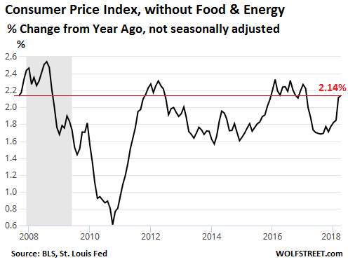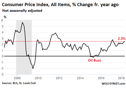 So here are the numbers: The Consumer Price Index (CPI) for April, which the Bureau of Labor Statistics released this morning, was 2.5% higher than a year ago. That increase may have been “lower than expected” – who’s doing the expecting? – but it was the fastest increase since February 2017.