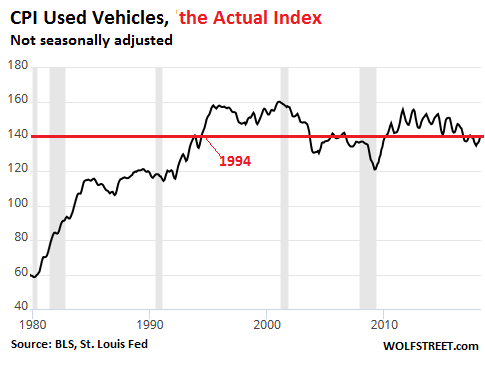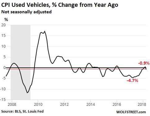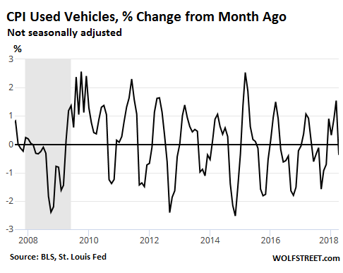 On a 12-months basis — not seasonally adjusted because there are no seasonal factors to worry about — the used vehicle CPI fell 0.9%, but that’s way up from year-over-year declines that were over -4.0% during the 12-month period between August 2016 and July 2017, and as steep as -4.7% in April 2017. So now, those price declines are disappearing, but given the volatility of the used vehicle CPI, they’re not disappearing smoothly, and there are going to be zigs and zags, and we just had one of the zags: