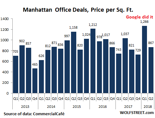 The price Google had forked over for its trophy building in Q1 ($2,181 per square foot) pushed the average price to a record $1,266 per square foot. But in Q2, the average price fell 16% from a year ago to $867 per square foot, near the lower portion of the range of the past few years: