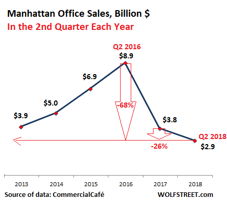 In the second quarter, sales of large office properties in Manhattan fell 26% from the same period a year ago. It was the worst Q2 dollar volume in years: