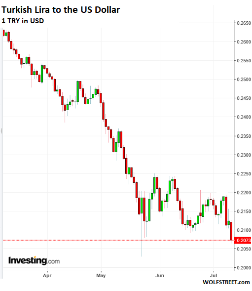 Erdogan, reelected for another term with significantly expanded powers, has appointed his son-in-law as Economy Minister. That was on Monday. Then, on Tuesday he claimed the exclusive power to appoint central bank rate-setters, just as he had promised he would before the elections. This removes even the last doubt about the independence of the central bank. Erdogan then pledged to decrease, rather than increase, interest rates. And the lira has plunged 5.2% against the dollar starting on Monday. It has plunged 21% since early March and 75% over the past decade: