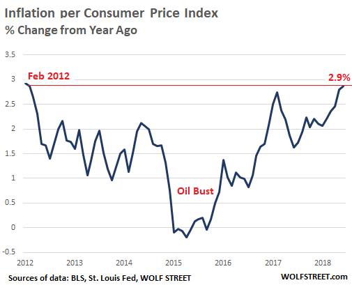 Today, by his standards, inflation looks even better. In June, the Consumer Price Index for all urban consumers rose a brisk 2.9% compared to a year ago, the sharpest increase since February 2012::