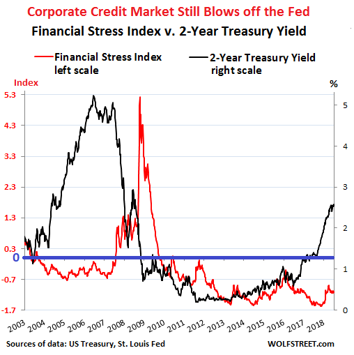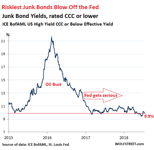 The Fed’s explicit purpose of “removing accommodation” – hiking interest rates and unwinding QE – is to tighten the ultra-loose “financial conditions” that have prevailed for the past nine years. By tightening “financial conditions,” the Fed is trying to bring markets “gradually” – rather than all at once – back to earth: higher yields, wider spreads, higher risk premiums, etc. By definition, this entails lower asset prices for investors and more expensive and harder to get credit for borrowers, particularly at the riskier part of the spectrum. But for now, the strategy is not working.