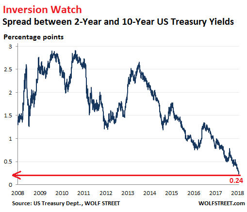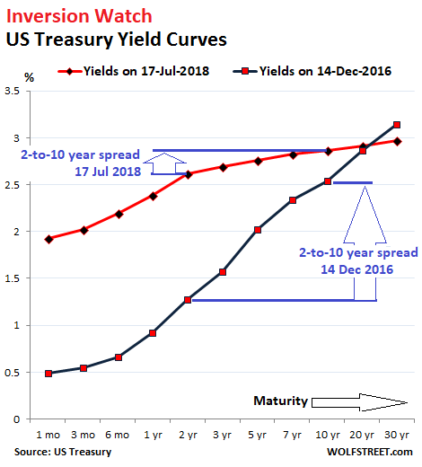 Markets are by now taking this “yield curve inversion” for granted. It’s going to happen, it’s just a matter of time, they say, and whether it’ll be next week or at the next rate hike is not crucial.