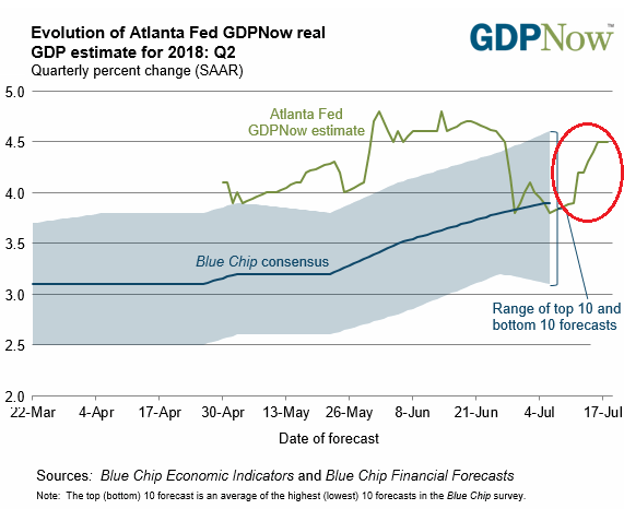 The Atlanta Fed is out with a huge GDP growth number for Q2, after raising it from already high levels in early July: Its nowcast hit 4.5% on July 16 and stayed there on July 18 after real consumer spending for May, industrial production, real private fixed investment, and real private inventory investment data were released.