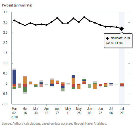 However, the New York Fed’s nowcast is raining on this parade. Released every Friday, it peaked on June 1 at 3.26% and has since been in decline, going the opposite direction of the Atlanta Fed’s GDPNow. Friday’s estimate dropped to 2.69%, the lowest in the series for Q2: