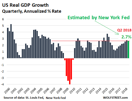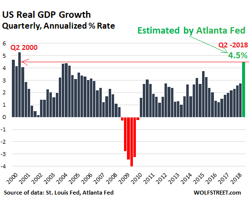 How big is a 4.5% seasonally adjusted annual GDP growth rate? This is a huge number for the US. The last time the US economy grew at a 4.5% annual rate was…. Well, we have to dig deep into history… let’s see, back in the day… the Clinton era… in Q2 2000 (5.2%):