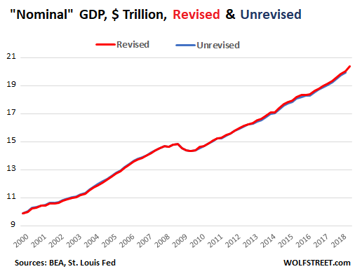This chart shows the new “real” GDP in trillion dollars (revised, red line) and the old “real” GDP (unrevised, blue line):