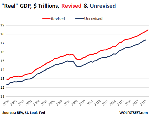 These revisions, updates, and adjustments impacted many aspects of the entire pile of national data. But one adjustment stood out, an increase in “real” GDP by nearly $1 trillion, from $17.37 trillion in Q1 (unrevised) to $18.32 trillion in Q1 (revised) – a difference of $952 billion.