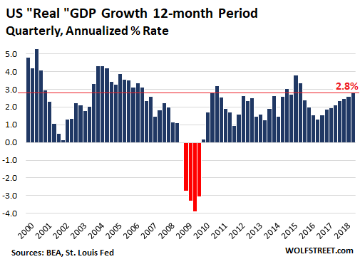 A less volatile measure and producing less big-looking results is the 12-month change in “real” GDP, which the BEA’s data set also provides. This is the inflation adjusted, seasonally adjusted annual rate of GDP growth – in other words, how GDP did over the past 12 months. For the 12 months ending in Q2, it rose 2.8%.