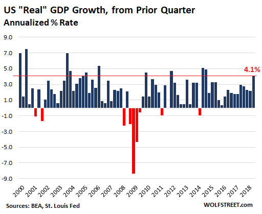 Based on this revised data, second-quarter “real” GDP (adjusted for inflation) increased at a seasonally adjusted annual rate of 4.1% from the prior quarter. Annual rate means that if GDP continues to increase for four quarters in a row at the current rate, the 12-month GDP growth would be 4.1%. This was the highest growth rate since Q3 2014: