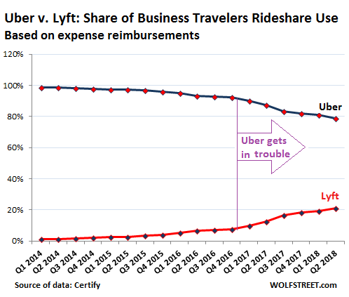 But within the rideshare universe of reimbursed ground transportation, it’s a raging battle for market share between Uber and Lyft. Uber was first and had the small pieces it was carving out from rental cars and taxis all to itself initially. Then Lyft came along and gradually started eating into Uber’s market share. But both were taking share away from taxis and rental cars at an astounding pace, and Uber’s loss of market share to Lyft was no big deal.