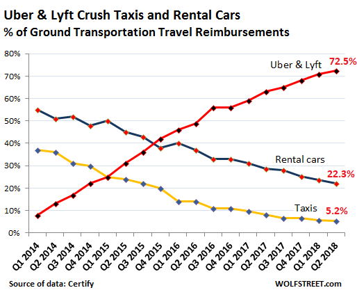 At the same time, rental-car share of reimbursed ground transportation plunged from 55% in Q1 2014 to just 22% in Q2 2018. And the share of taxis plunged from 37% to just 5%: