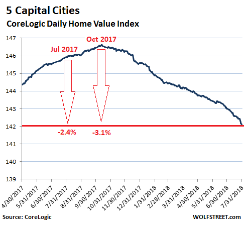 This is “a relatively mild downturn to date considering values remain 31% higher than they were five years ago,” said CoreLogic head of research Tim Lawless in a report titled, “Housing Downturn Gathers Momentum In July.” With the implication that there’s a lot more room to fall?
