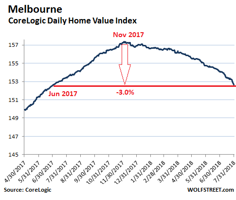 Melbourne lags a few months behind Sydney but is now catching up. Home prices in Melbourne fell 0.5% in July year-over-year, according to CoreLogic, and are down 3.0% from their peak at the end of November 2017: House prices fell 1.4% from a year ago while condos are still up 2.3%. The index is now back where it had been at the end of June, 2017: