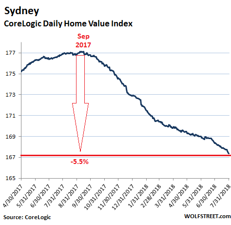 In Sydney, Australia’s largest housing market and one of the world’s biggest housing bubbles, prices of homes of all types fell 5.4% in July compared to a year ago, and 5.5% from the peak in September. Prices of single-family houses dropped 7.0%, and prices of condos (“units”) fell 1.6%, according to CoreLogic’s Daily Home Value Index: