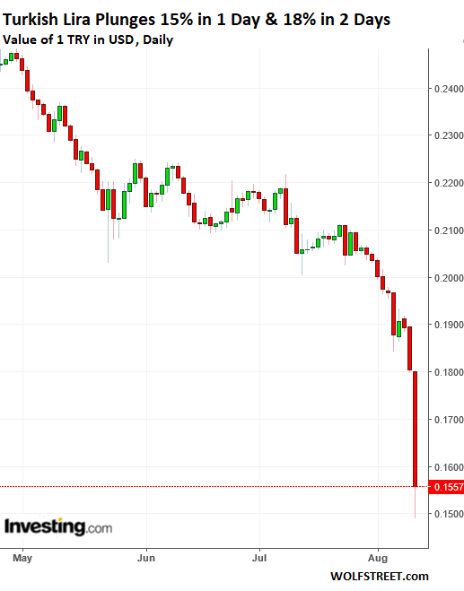 On Friday, the Turkish Lira plunged 15% against the US dollar. Over the past two days, it has plunged 18%. Over the past four months — shown in the chart below — it has plunged 38%: