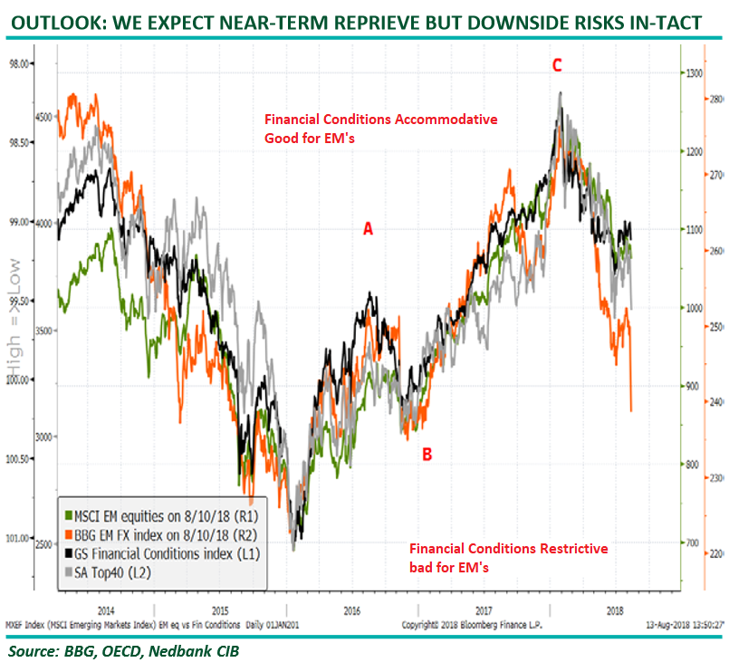 It is very evident on this chart (below) that the changing financial conditions have been the major driver of EM and SA asset prices over the last several years. The risk-on phase ended in January and all EM assets sold-off. EM-FX are however now taking the lead and the next few days will indicate whether this will spill over into the other asset classes.
