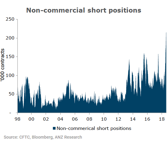 ANZ analysts Daniel Hynes and Soni Kumari say in the past, “such extreme levels of short positions have led to a rally in prices”:
