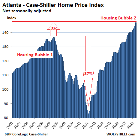 Home prices in the Atlanta metro rose 0.7% in June from May, according to the Case-Shiller index, and 5.7% over the 12-month period. It now exceeds the peak of Housing Bubble 1 in July 2007 by 8%: