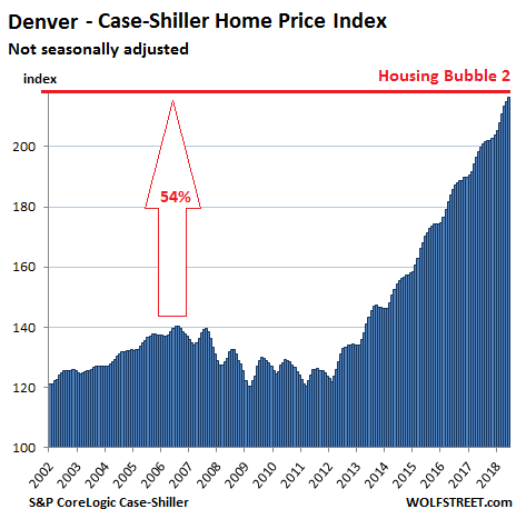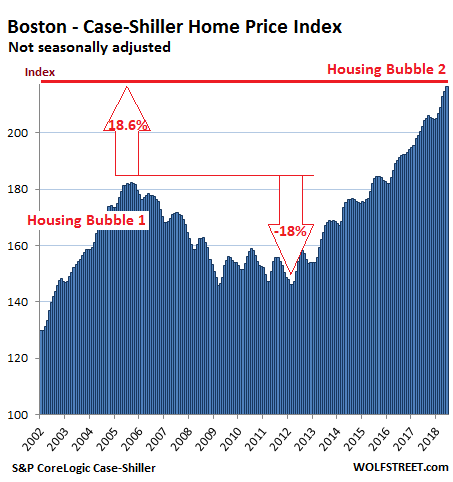 The Case-Shiller Home Price Index for the Boston metro jumped 7.1% from a year ago. During Housing Bubble 1, from January 2000 to October 2005, the index soared 82% before dropping. It now tops that crazy peak by 18.6%: