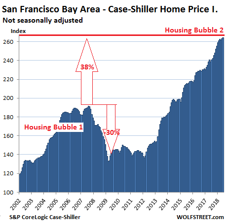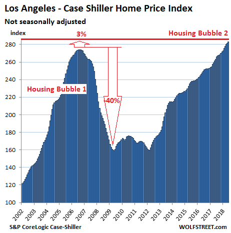 The Case-Shiller index for the Los Angeles metro in June rose 7.4% year-over-year. Between January 2000 and July 2006, the index had skyrocketed 174% before its epic collapse. The index now exceeds the complete nut-job of Housing Bubble 1 by 3%: