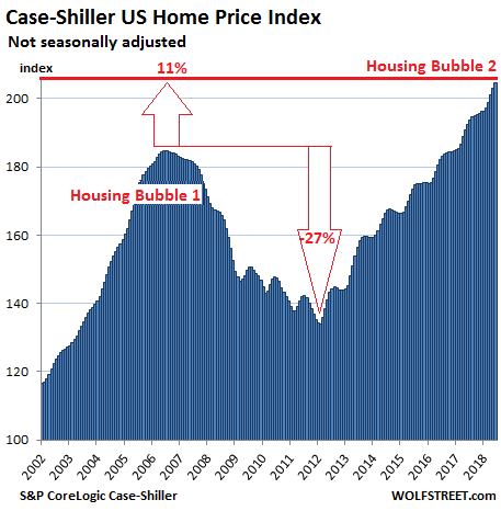 On a national basis, home prices surged 6.2% in June compared to June last year (not seasonally-adjusted), and 0.8% from May, according to the S&P CoreLogic Case-Shiller National Home Price Index released this morning. The index is now 11% above the July 2006 peak of “Housing Bubble 1” — the first housing bubble in this millennium. After its collapse, it was called a “bubble” and “unsustainable.” But by now, this peak of the collapsed bubble has been transformed into the new-normal rock-solid base of the current housing market. The index is now 53% above the bottom of “Housing Bust 1”: