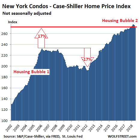 Prices for condos in the New York City metro fell — yes, fell — 1.6% from the prior month, the third month in a row of monthly declines, according to the Case-Shiller index for condos. The index is now down 2.2% from the peak in March and is up only 0.6% year-over-year and at the lowest level since October 2017:
