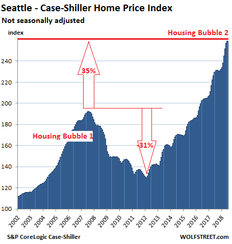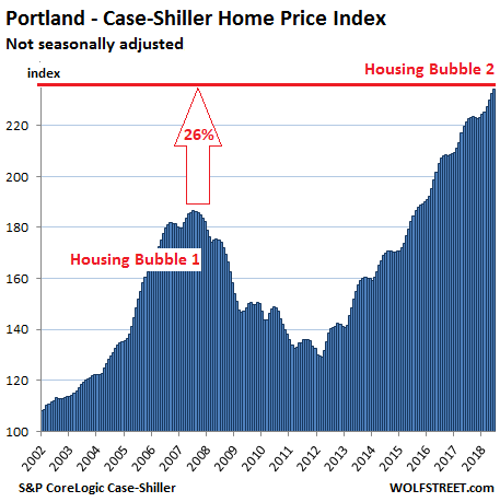 Home prices in the Portland metro in June rose 0.7% from a month ago, 5.9% from a year earlier, and 26% from the crazy peak of Housing Bubble 1 in July 2007. It has ballooned 134% since 2000:
