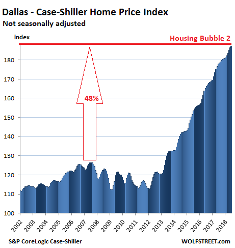 The Case-Shiller index for for the Dallas-Fort Worth metro rose for the 53rd month in a row, and is up 5.2% from a year ago. Since its peak during Housing Bubble 1 in June 2007, the index has surged 48%: